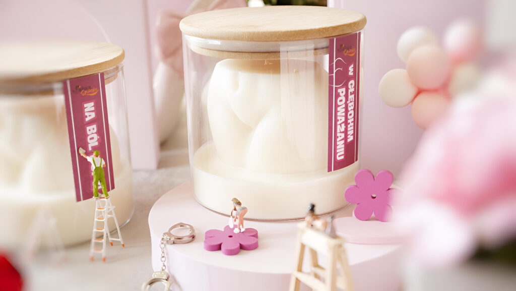 Prowokacyjną formę zamknęliśmy w galanteryjnej oprawie. Każda świeca została zamknięta w przezroczystym, szklanym słoju z drewnianą, pięknie szlifowaną pokrywką z uszczelką. Wygląda to jak eksponat z muzeum sztuki współczesnej – elegancko, stylowo i z klasą. Drewno dodaje naturalności, szkło pozwala podziwiać detale, a całość tworzy spójną, estetyczną kompozycję.
