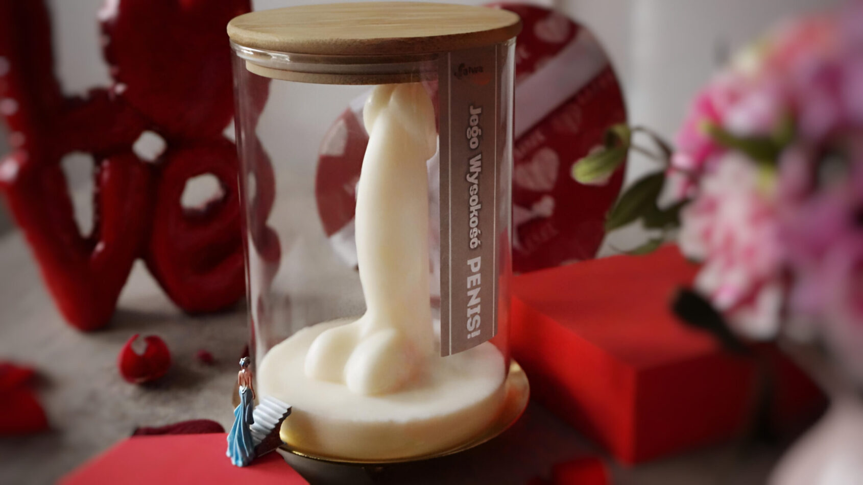 Zaprojektowaliśmy je przede wszystkim jako obiekt do podziwiania – figurę, która swoją formą cieszy oko, wywołuje uśmiech i lekkie rumieńce. Jeśli jednak zdecydujesz się stopić to woskowe arcydzieło, pamiętaj: szklany słoik z drewnianą pokrywką świetnie nadaje się do ponownego wykorzystania. Idealny na drobiazgi, sekrety albo kolejne niegrzeczne pomysły.