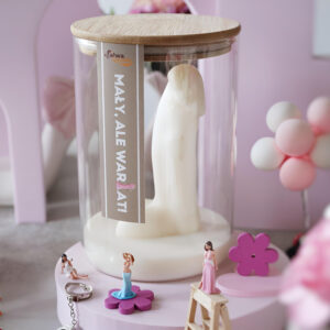 Zaprojektowaliśmy je przede wszystkim jako obiekt do podziwiania – figurę, która swoją formą cieszy oko, wywołuje uśmiech i lekkie rumieńce. Jeśli jednak zdecydujesz się stopić to woskowe arcydzieło, pamiętaj: szklany słoik z drewnianą pokrywką świetnie nadaje się do ponownego wykorzystania. Idealny na drobiazgi, sekrety albo kolejne niegrzeczne pomysły.